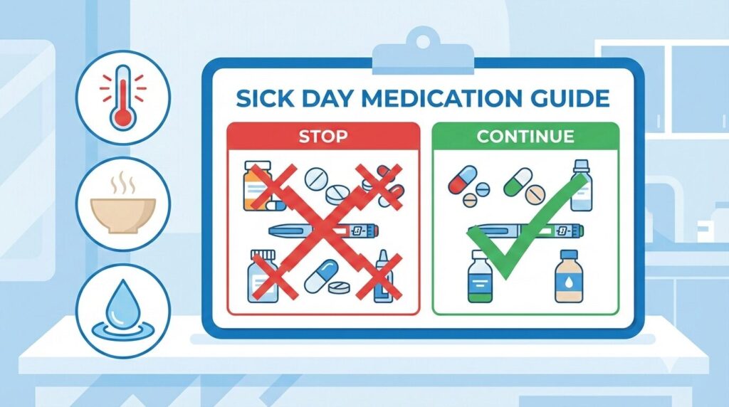シックデイ(発熱・嘔吐・下痢で食事不可)時、糖尿病薬は「休薬が原則の薬」と「中止が危険な薬」が混在。メトホルミン・SGLT2・SU/グリニド・基礎インスリンの対応を早見表と電話トリアージ3項目で整理。 -