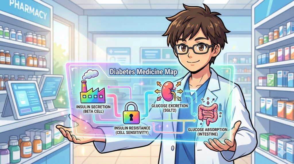 糖尿病治療薬を「病態(分泌低下/抵抗性)」から整理し、分類と使い分けを解説。SU、DPP-4、SGLT2、GLP-1、α-GI、メトホルミン、ツイミーグまで、処方解析の型が身につく新人薬剤師向けまとめ。 -